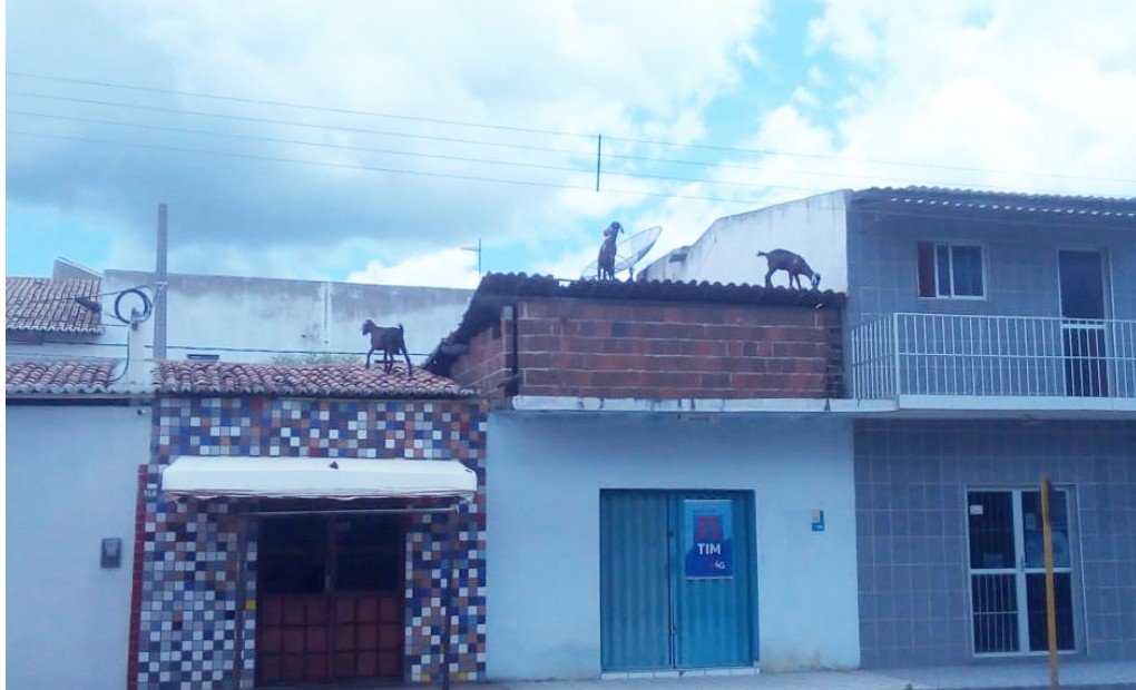 Quatro bodes (caprinos) chamaram a atenção dos moradores de Felipe Guerra (RN) ao meio dia desta sexta-feira (15). Os animais foram parar no telhado de um dos estabelecimentos comerciais no Centro da cidade e ficaram passeando em cima dos mesmos.