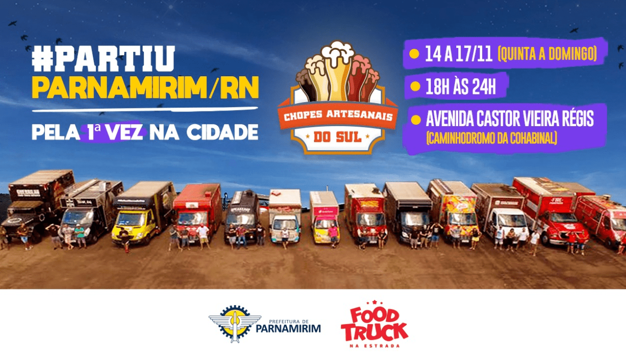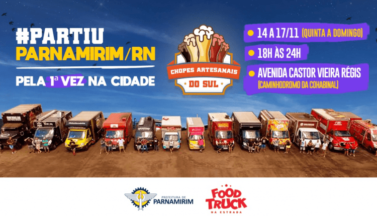 Parnamirim receberá a partir de amanhã, 14 até domingo, das 18h às 24h, na Avenida Castor Vieira Régis, na Cohabinal o Festival Food Truck na Estrada. Trata-se do maior evento gastronômico do País e que tem o apoio da Prefeitura de Parnamirim.