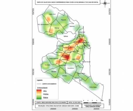 O mapa de calor com os casos confirmados da Covid-19 em Natal, no ano de 2020, revela áreas com concentração de casos em todas as regiões do município. Os distritos sanitários Norte e Leste registraram áreas com maior intensidade de casos confirmados. No distrito Leste os bairros com o maior número de casos próximos foram Rocas e Ribeira. Já na região Norte, Potengi foi o bairro que apresentou a maior intensidade de casos.