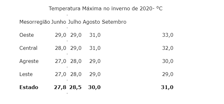 As temperaturas médias do Estado deverão variar em junho, entre 20,8°C e 27,8°C, em julho, entre 19,5ºC e 28,5°C, em julho, 20,0°C e 30ºC em agosto, 22° e 31ºC, em setembro. Nas regiões serranas poderão acontecer temperaturas com variando entre 15oC a 16oC, nas regiões serranas (Serra de Martins, Serra de Santana, Serra João do Vale, Serra do Doutor e Serra de São Miguel).