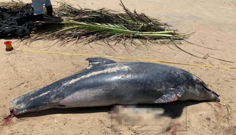 De acordo com o Cetáceos, além da ausência da cauda, o golfinho também apresentava um grande corte na região abdominal.