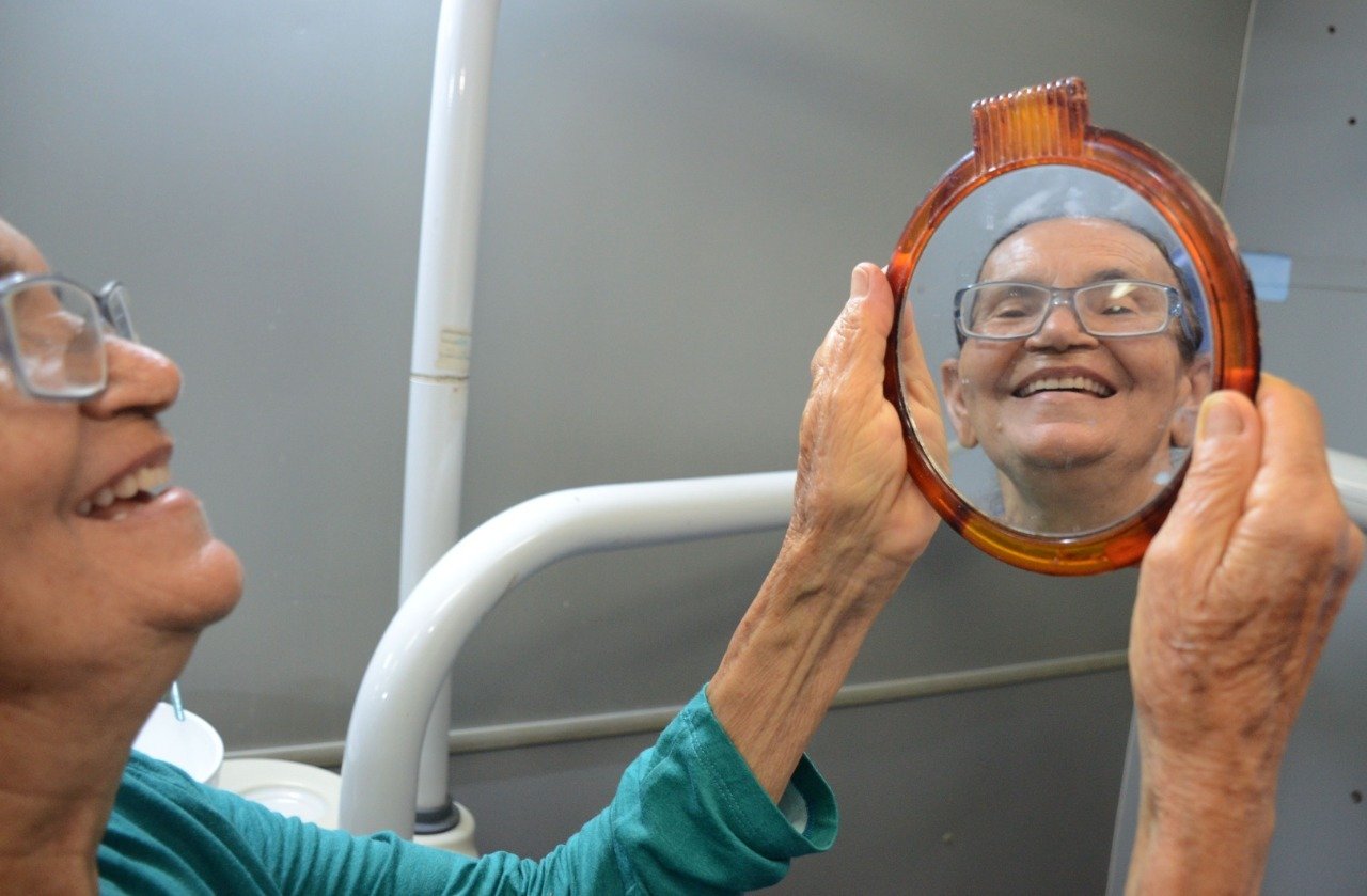 Uma das contempladas foi a Dona Luzia Mesquita, de 77 anos. Ela é moradora do bairro e agradeceu a o oportunidade em poder renovar o sorriso. “Eu estou muito feliz que eu coloquei a minha prótese. Agradeço a administração e a todos aqui da Unidade que me acolheram muito bem. É gratificante poder ter um sorriso renovado”, disse Dona Luzia, que fez questão abrir um sorrisão para foto.