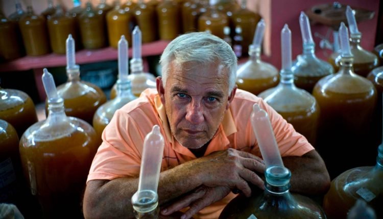 O fabricante de vinho Orestes Estevez usa camisinhas para fechar galões de vinho para realizar o processo de vinificação (fermentação alcoólica) do produto.