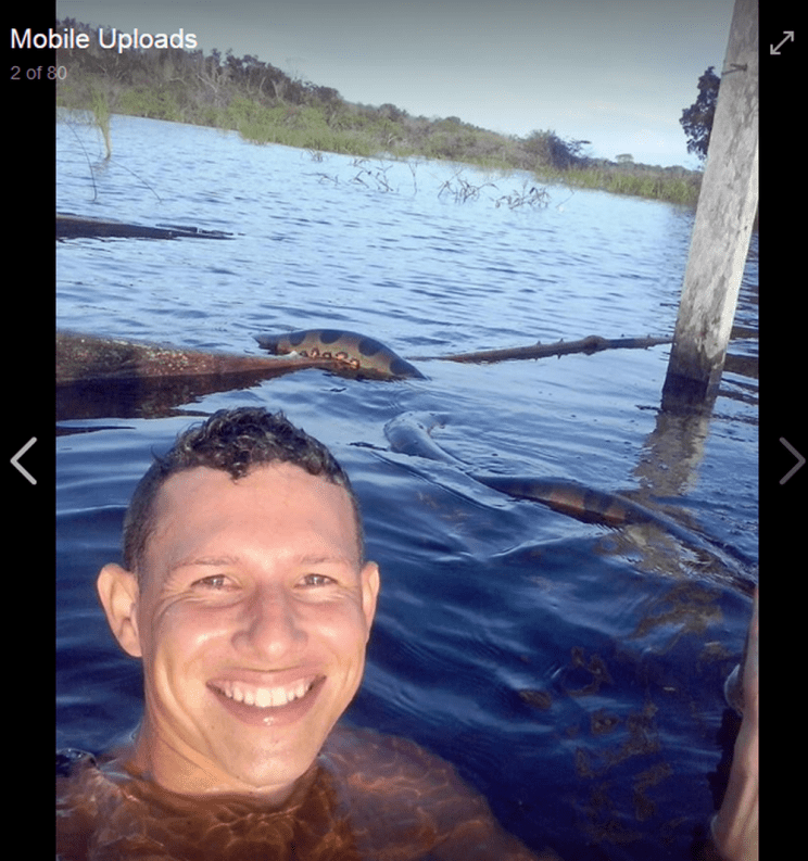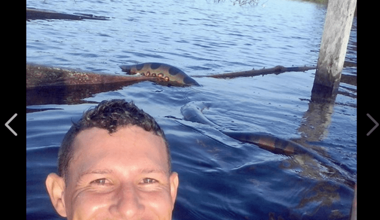 Jovem tira selfie com sucuri gigante em rio no Amazonas