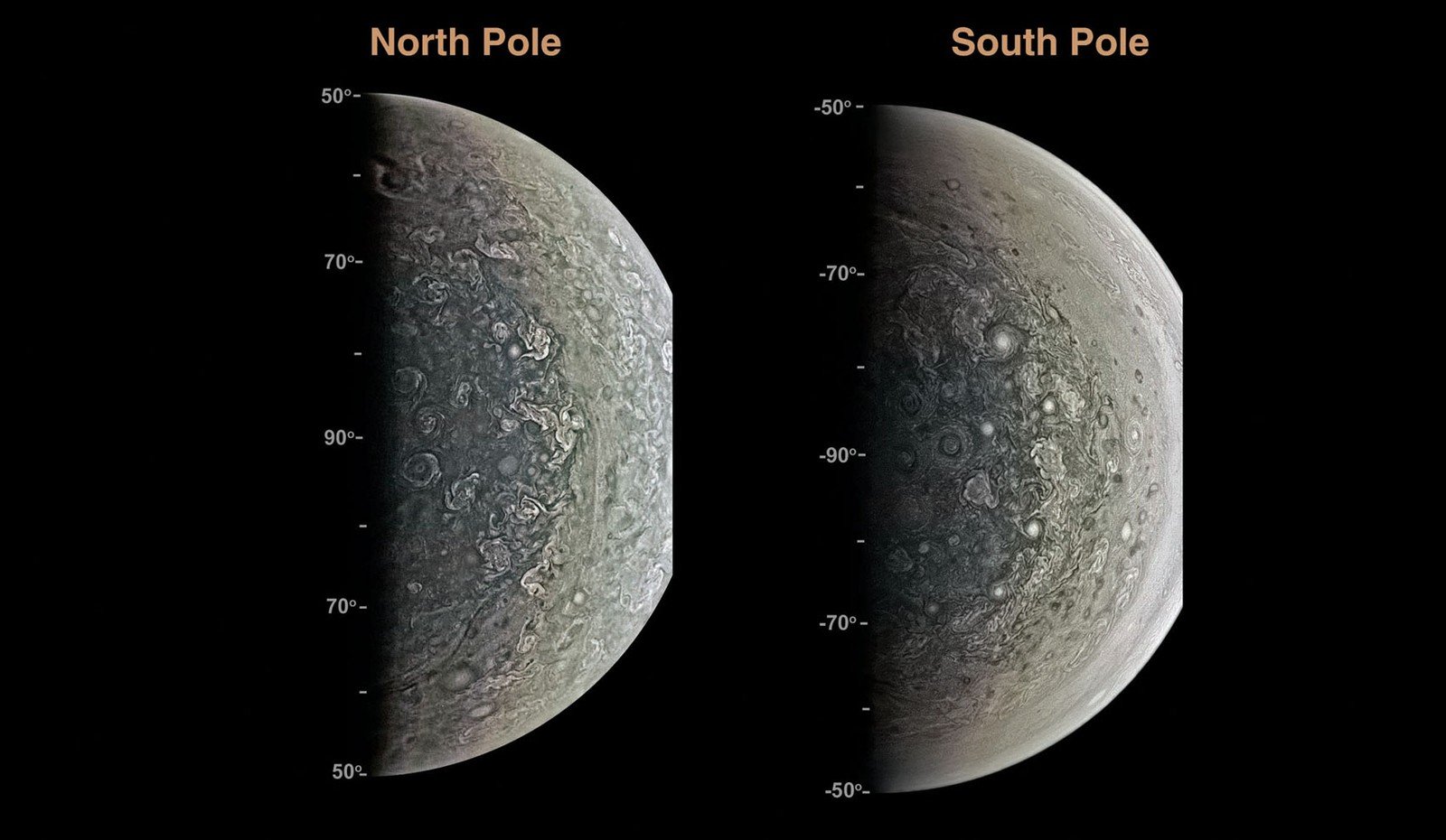 Um dos estudos divulgados nesta quinta descreve as imagens dos polos de Júpiter feitas por Juno: elas revelam diversas estruturas em formato oval. Uma sequência de imagens feita ao longo do tempo indica que tratam-se de ciclones com diâmetro de até 1,4 mil quilômetros.