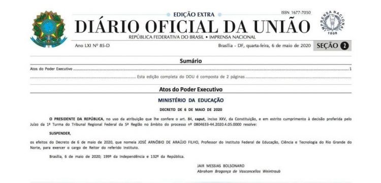 Opresidente Jair Bolsonaro suspendeu a nomeação do professor José Arnóbio para reitor do Instituto Federal do Rio Grande do Norte (IFRN), em decreto publicado nesta quarta-feira (6). O documento também foi assinado pelo ministro da Educação Abraham Weintraub. Arnóbio havia sido eleito para ocupar o cargo em dezembro de 2019.