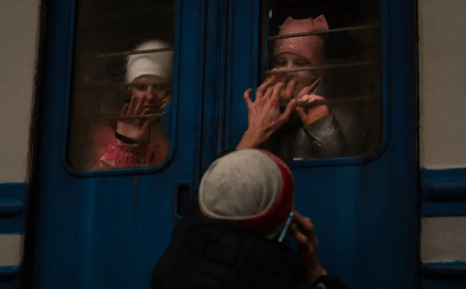 Celular na mão como se pudesse unir som e imagem reais uma última vez antes da partida do trem, Yevgeni Gonishuk se aproximava e se afastava da janela do trem parado na estação central de Lviv, no oeste da Ucrânia. Dentro da composição estava, sua esposa Oksana e os filhos Anya, de 9 anos, e Ilya, de 13, prestes a realizar uma viagem de aproximadamente 2 horas até a cidade polonesa de Przemysl.