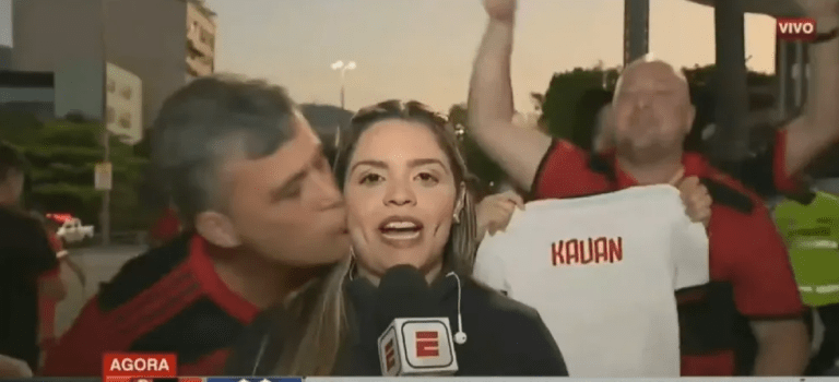 A jornalista entrava ao vivo para falar do clima do jogo quando um torcedor se aproximou e, sem autorização, deu um beijo no rosto dela. Logo em seguida, a imagem voltou para o estúdio. O Flamengo repudiou a atitude do rubro-negro.