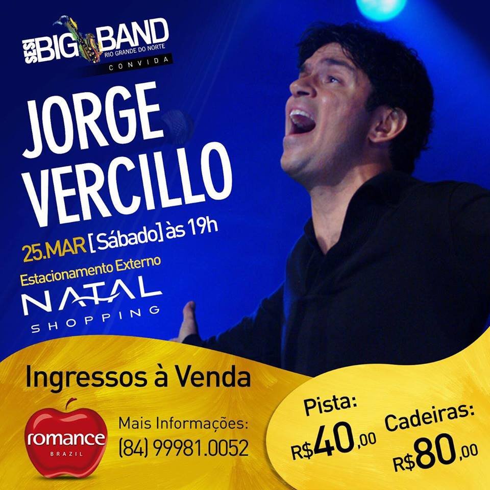 A venda de ingressos para o show da Sesi Big Band convida Jorge Vercillo, que acontece no dia 25 de março, às 19h, no estacionamento externo do Natal Shopping, teve início nesta terça-feira (7). O público pode realizar a compra nas lojas Romance Brazil do Midway Mall, Praia Shopping e do Natal Shopping, nos valores de R$40 pista e R$80 cadeiras.