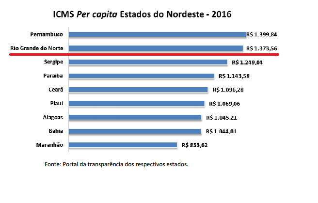 O Rio Grande do Norte é o segundo estado nordestino com maior arrecadação per capita do Imposto sobre Circulação de Mercadorias e Serviços (ICMS), com um valor de R$ 1.373,56 para cada habitante. A primeira posição é ocupada por Pernambuco que tem uma arrecadação per capita de ICMS de R$ 1.399,84. Esse indicador mostra a relação entre o volume recolhido desse imposto distribuído entre a população do estado. O Rio Grande do Norte alcançou essa posição em função do total arrecadado desse imposto, que é a principal fonte de receita do tesouro estadual, ano passado. Foram mais de R$ 4,7 bilhões recolhidos ao longo de 2016.