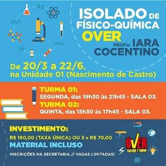 Estão abertas as inscrições para o curso de Físico-Química do Over Colégio e Curso. Voltadas para os estudantes que desejam aprofundar seus conhecimentos na área, as aulas serão ministradas pela professora Iara Cocentino. O curso conta com duas turmas, a primeira com aula toda segunda-feira – das 19h30 às 21h45 – e a segunda com aula toda quinta-feira das 15h30 às 17h45.