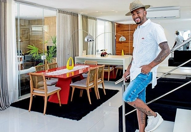 O imóvel, de três andares, tem quatro suítes e custou 2 milhões de reais. “Pedi desconto, mas não ganhei”, diverte-se. “Nunca imaginei morar numa casa assim”, diz ele, que cresceu no Morro do Borel. “Quando passei a ganhar dinheiro, não me deslumbrei. Morava em barraco, levantei minha casa e investi”, diz.