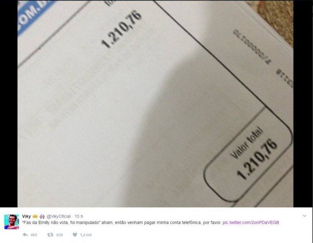 O perfil @VikyOficial supostamente recebeu uma conta de telefone no valor de R$ 1.210,76. “Fãs da Emilly não votam, foi manipulado.” Aham, então venham pagar minha conta telefônica, por favor”, escreveu o usuário da rede social. Os tuítes eram públicos, mas o internauta tornou a conta privada nesta tarde.