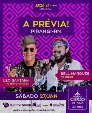 O carnaval vai invadir o verão de Pirangi! No dia 27 de janeiro a praia mais badalada do litoral sul recebe a festa “A PRÉVIA”, um super aquecimento para o carnaval ao som de Bell Marques, no palco, e Léo Santana, no trio pranchão. Muito axé em uma festa de novo formato, como você nunca viu!