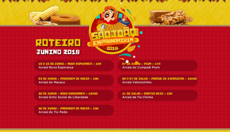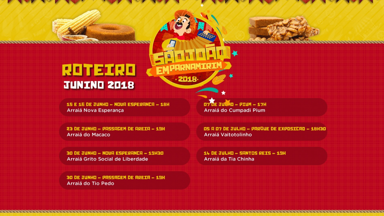 Os festejos começam nesta sexta-feira (15), às 18h com o Arraiá Nova Esperança e segue até o dia 14 de julho, com o Arraiá da Tia Chinha, também em Nova Esperança.
