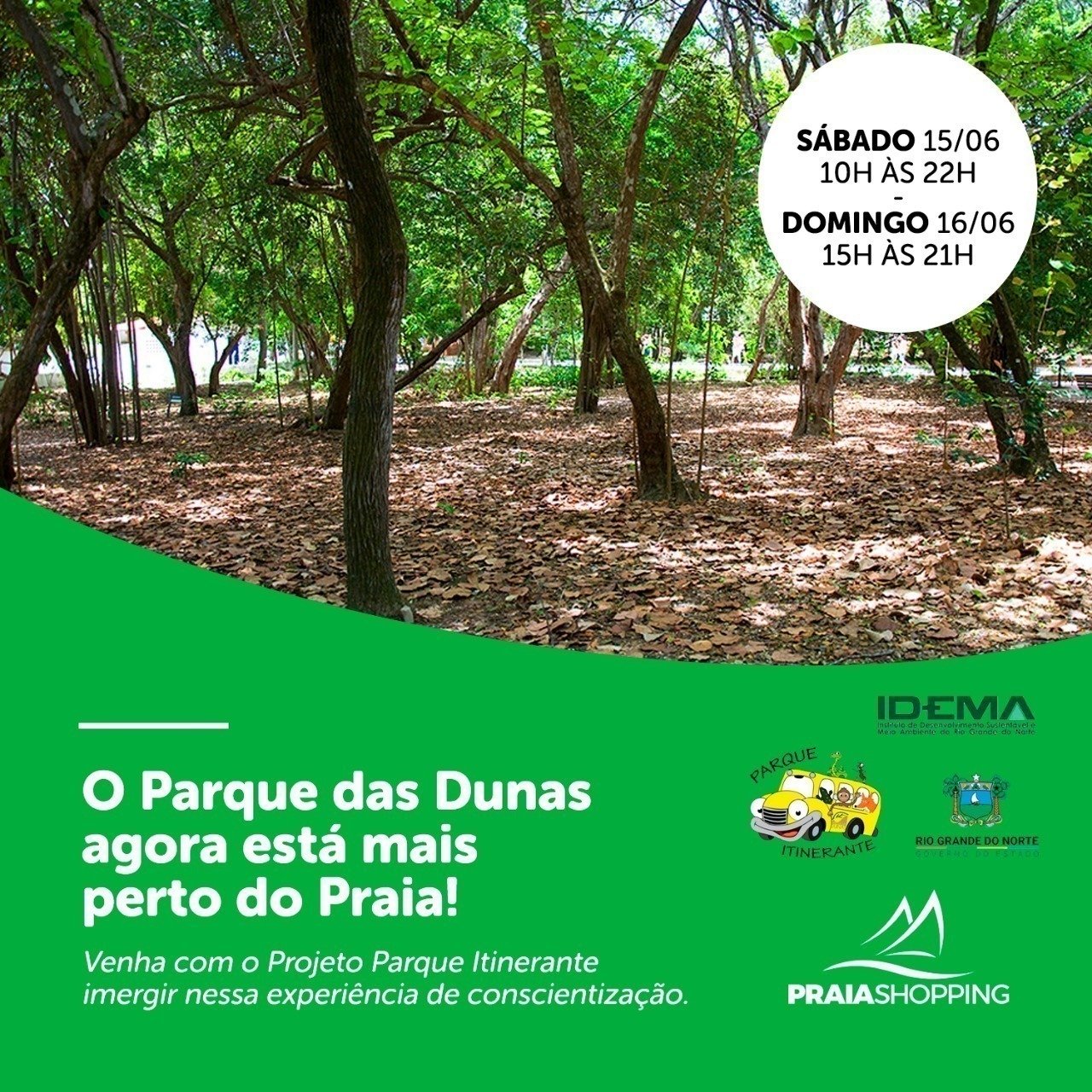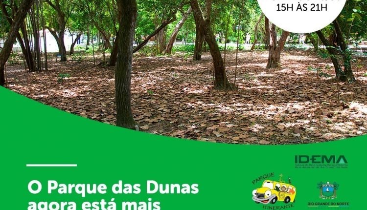 Como um dos mais importantes projetos para disseminar a preservação ambiental, o projeto Parque Itinerante, estará com exposição no próximo final de semana, no Praia Shopping, em Ponta Negra. No sábado (15), o horário de visitação será das 10h às 22h, e no domingo (16), das 15h às 22h. O Parque Itinerante é um projeto do Instituto de Desenvolvimento Sustentável e Meio Ambiente (Idema) e tem como principal objetivo multiplicar conhecimento acerca do Parque das Dunas e proteção aos ecossistemas.