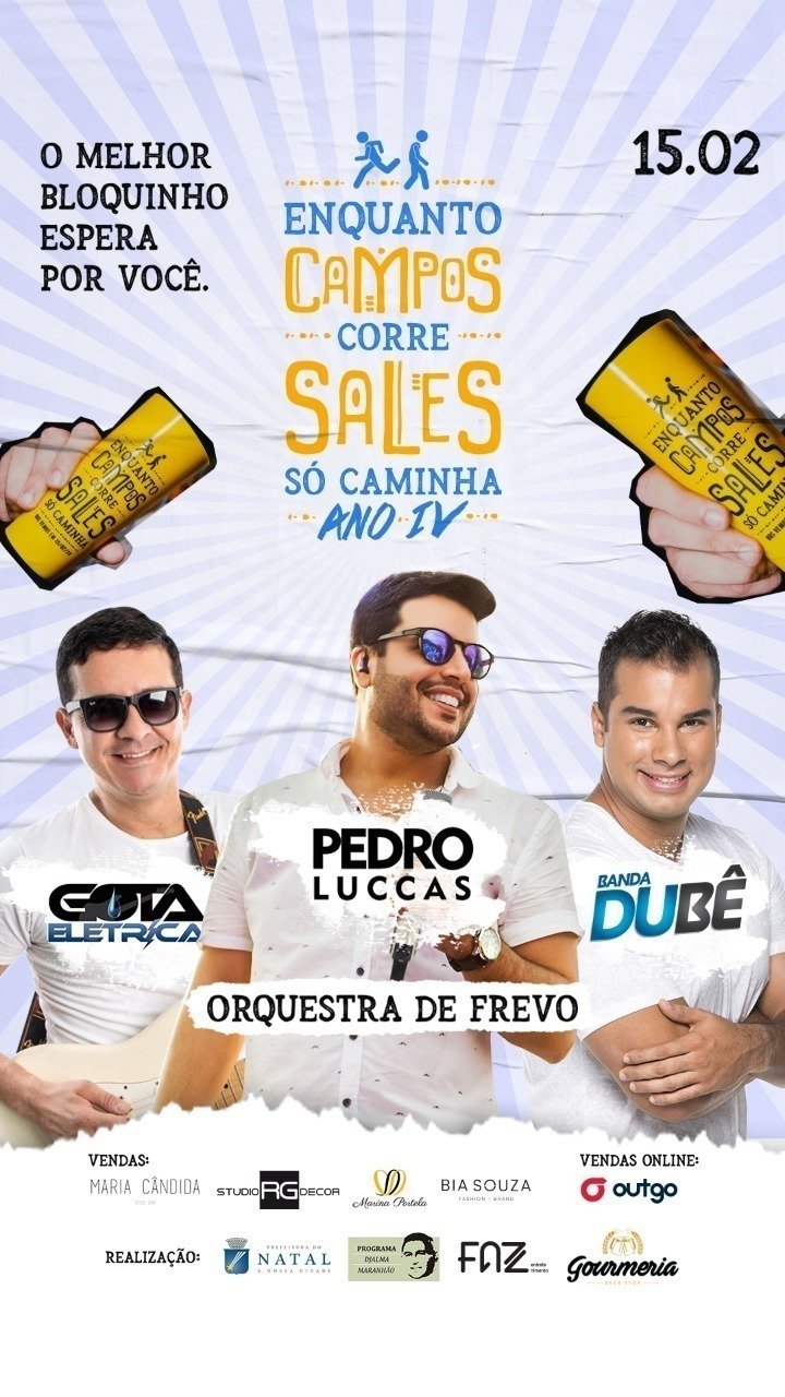 ucesso no pré-carnaval de Natal, o bloco “Enquanto Campos Corre, Sales Só Caminha” promete ser ainda melhor na folia de 2020. Em sua quarta edição, a festa acontecerá no dia 15 de fevereiro (sábado que antecede o carnaval) com novidades.
