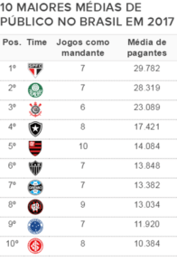 Por sua vez, o Atlético-PR desceu três posições no levantamento. A média do Furacão, que era de 14.914, caiu para 13.034 torcedores. Um dos motivos pode estar na redução do número de torcedores nos últimos jogos. Dos três piores públicos do clube paranaense na Arena da Baixada em 2017, dois foram registrados justamente nas últimas duas vezes que a equipe comandada pelo técnico Paulo Autuori entrou em campo.
