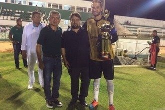 O goleiro e capitão Camilo, da equipe do Santa Cruz de Natal, recebeu das mãos d vice-presidente da Federação Norte-rio-grandense de Futebol (FNF), Daíilson Machado, a singela homenagem ao pai de Lupércio Segundo, presidente de honra do clube.