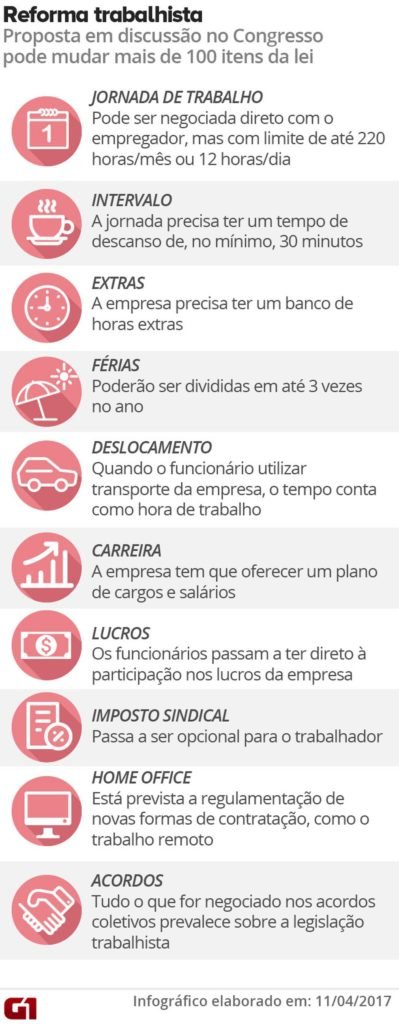 Entre os principais pontos do projeto estão a prevalência da negociação entre empresas e trabalhadores sobre a lei para pontos como flexibilização da jornada, fragmentação de férias, trabalho por produtividade e mudanças na representação dos trabalhadores dentro da empresa, mexendo na necessidade de representação sindical. Além disso, o projeto de lei prevê regulamentação nas modalidades de trabalho por home office (trabalho em casa) e intermitente, no qual os trabalhadores são pagos por período trabalhado.