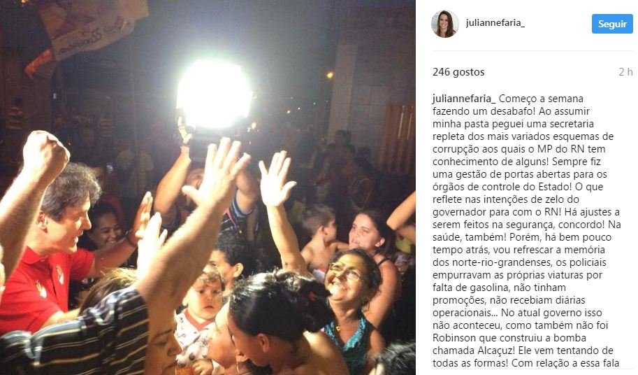 Na manhã desta segunda-feira (17), a secretária do Estado de Trabalho, da Habitação e da Assistência Social (Sethas) e esposa do governador Robinson Faria, Julianne Faria, utilizou as redes sociais para comentar as acusações que o marido vêm sofrendo por ter o nome citado na lista de investigações do ministro Edson Fachin, relator da Lava Jato no STF. No post, a primeira-dama acredita na ética e honestidade do governador, e ressalta a boa estrutura financeira que a família está inserida.