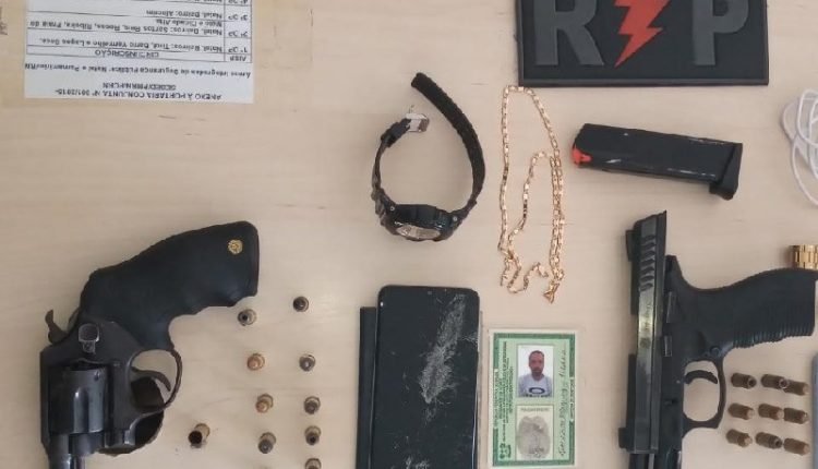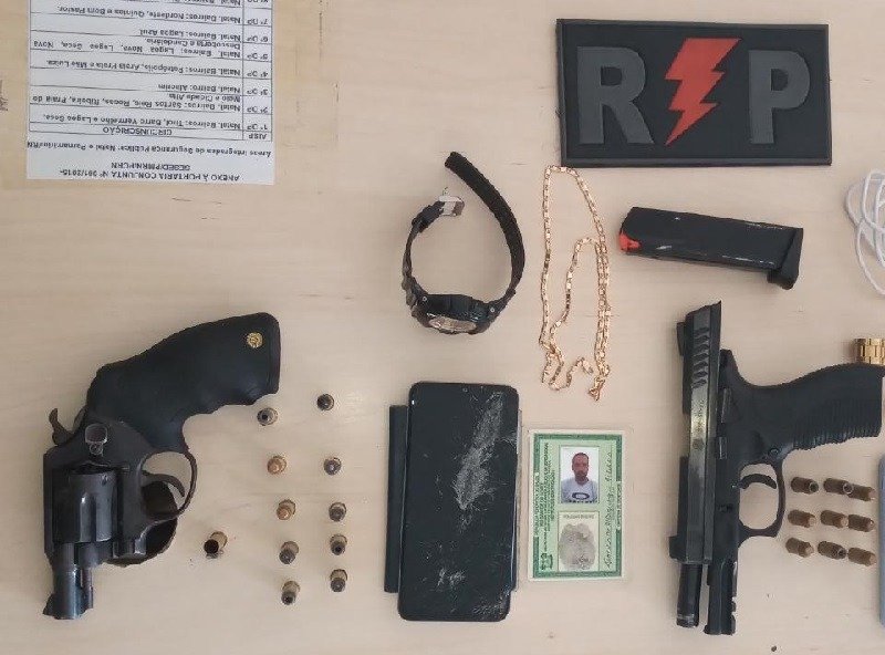 Com a quadrilha detida, os militares encontraram 01 Revólver Cal.38 da marca Taurus, 11 munições do mesmo calibre, 01 Pistola .40 com 09 munições, 03 aparelhos de telefone Celular, 02 relógios de pulso, 01 corrente dourada, 01 mochila, 01 Carteira de Trabalho, 01 documento veicular, uma pequena porção de Cocaína e a quantia de R$ 44,00 em espécie.