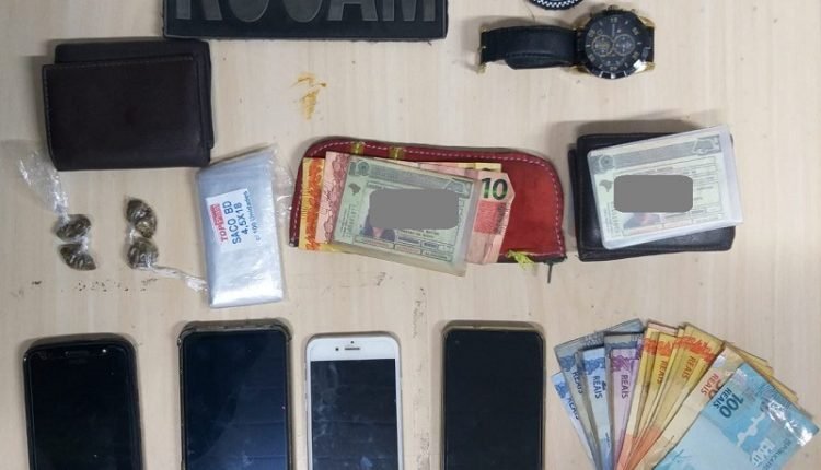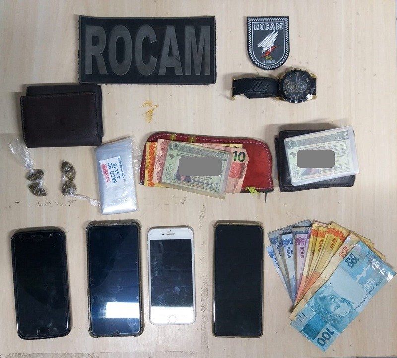 O infrator estava de posse de quatro aparelhos celulares, R$ 420,00 em espécie, duas carteiras com documentos pessoais em nome de terceiros, um relógio, além de quatro porções de maconha e sacos plásticos.