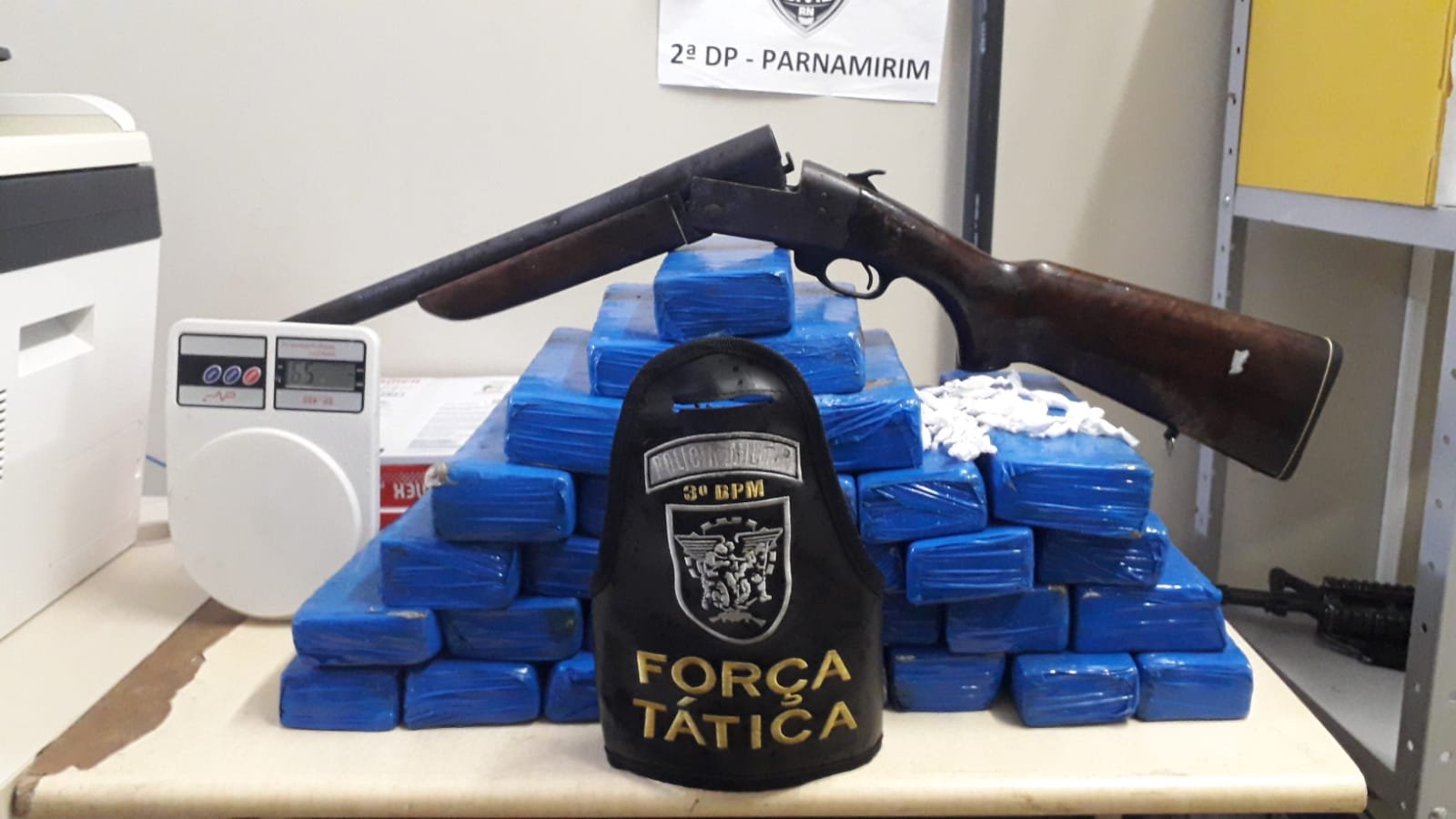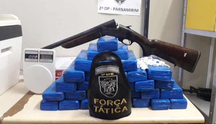 Na tarde desta quinta-feira (25), policiais militares da Força Tática do 3º Batalhão realizavam patrulhamento no bairro Parque de Exposições, na cidade de Parnamirim, quando após diligências, flagraram uma mulher, de 34 anos de idade, em posse de 20,3 quilos de maconha, 36 trouxinhas de cocaína, balança de precisão, além de uma espingarda calibre .12. A acusada e todo o material apreendido foram conduzidos à Delegacia.