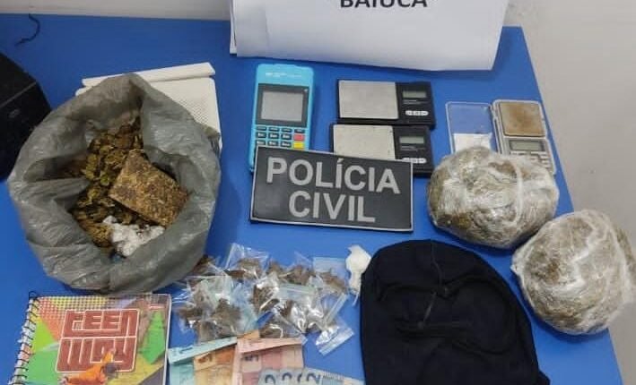Na posse do suspeito, foram encontrados e apreendidos: três tabletes de Skank, um pacote de maconha, dezenove porções de maconha, uma porção de cocaína, uma balança de precisão, um aparelho celular, uma balaclava, e a quantia de R$ 173,00 (cento e setenta e três reais).