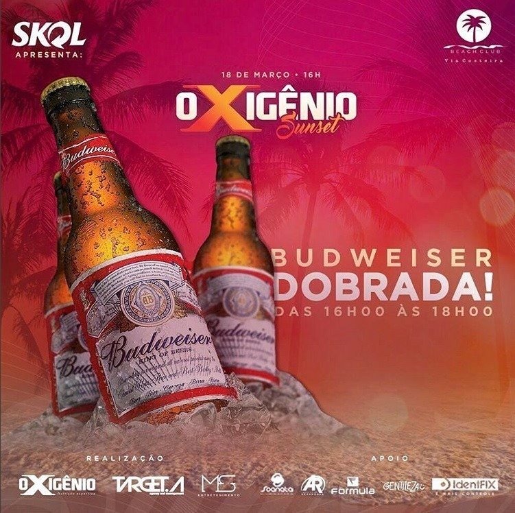 Após anunciarem um camarote exclusivo da Academia Fórmula no evento, os produtores da Oxigênio Sunset divulgaram essa semana mais uma novidade de peso. A festa, que acontece neste sábado (18), promete ser regada a muita cerveja. Isto porque durante duas horas de evento, das 16h às 18h, ao comprar uma cerveja da marca Budweiser o público será presenteado com uma segunda totalmente de graça.