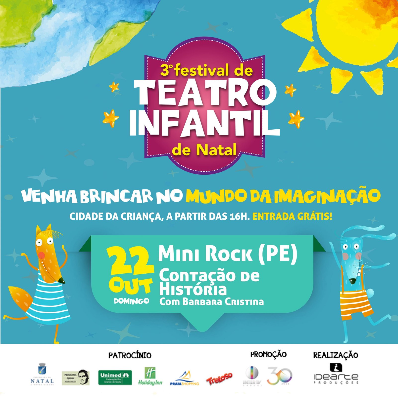 A programação do 3º Festival de Teatro Infantil de Natal (Festin) segue animada. Nesse fim de semana, várias atrações prometem divertir e encantar as crianças com espetáculos e shows gratuitos. Um dos destaques é o show da Mini Rock Banda Infantil, que apresenta versões rock’n’roll de clássicos como “Samba Lelê” e “O Trem Maluco” domingo (22), às 16h, na Cidade da Criança. Confira a programação completa no site https://idearteproducoes.com.br/site/.