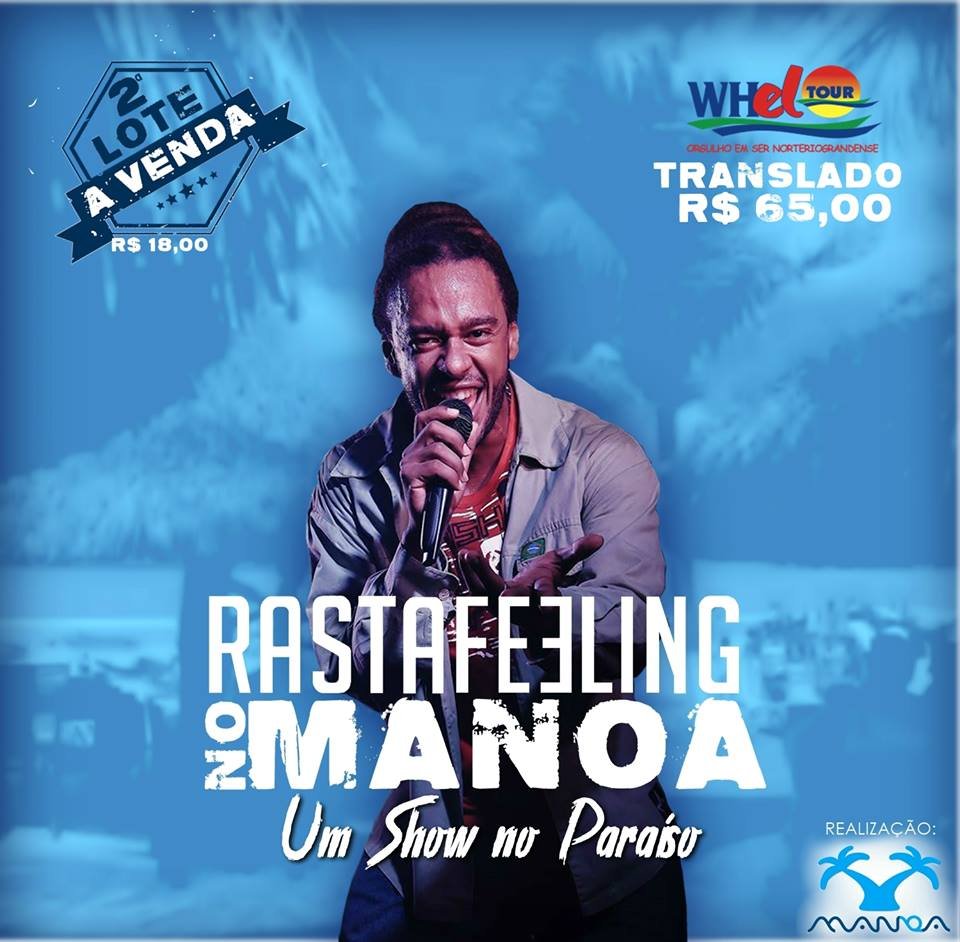Neste sábado, dia 18, o Manoa Park será palco de um super show. A banda Rastafeeling, uma das principais bandas de reggae do Estado, se apresentará no parque e promete um dia inesquecível. O show no paraíso será a partir das 16h30. Os ingressos estão à venda no Manoa Park, em Maracajaú, e no escritório do parque, em Natal. Mais informações: (84) 2030-6592 / 99658-0180.