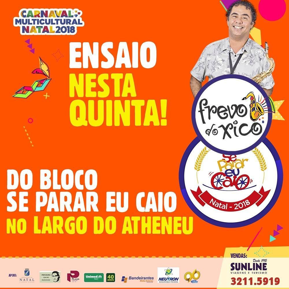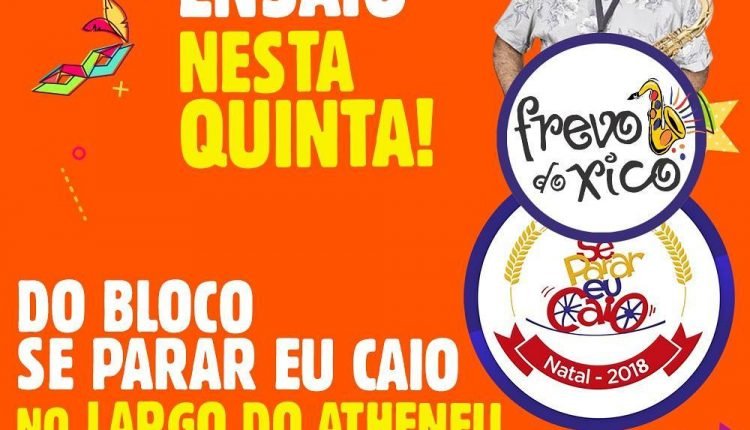 O Ensaio será no Largo do Atheneu, em Petrópolis, com a Orquestra Frevo do Xico. Além da primeira prévia do carnaval de Natal, a festa marcará também a apresentação oficial da camisa do “Se Parar Eu Caio” para 2018 e o lançamento do estandarte do Carnaval desse ano. O Ensaio tem início às 18h, com DJ Berto, logo em seguida, às 20h, tem a orquestra Frevo do Xico, até às 23h. A entrada é gratuita.