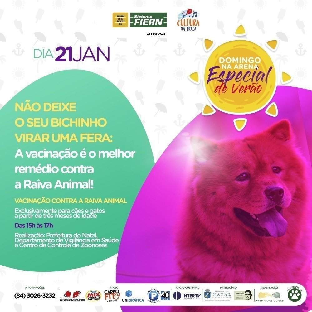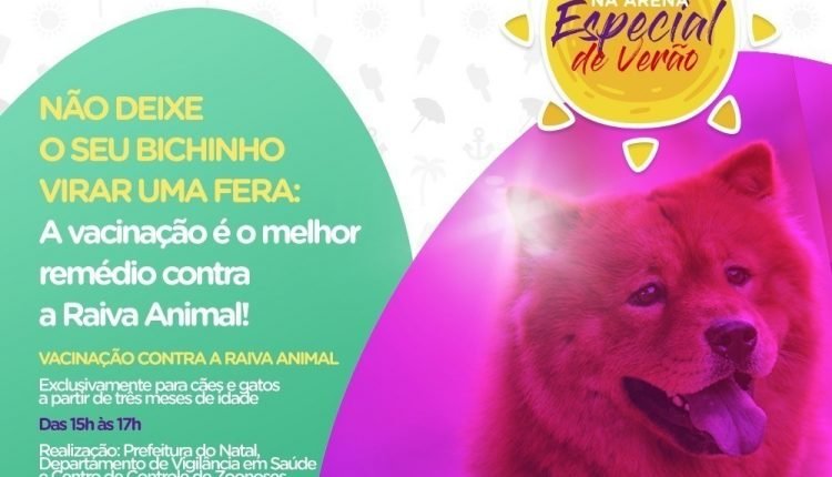 Os moradores de Natal que possuem cães ou gatos e que os animais não estejam com a vacinação antirrábica em dia podem buscar atendimento neste domingo (21), na Arena das Dunas, quando a Prefeitura do Natal, por intermédio do Centro de Controle de Zoonoses (CCZ), estará participando do ‘Domingo na Arena’.