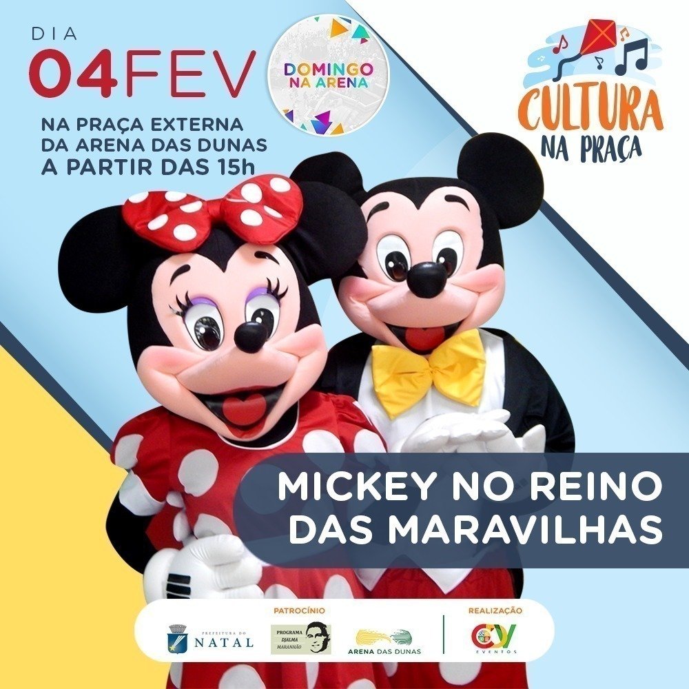 No próximo domingo (4), a apresentação infantil será o espetáculo Mickey no Reino das Maravilhas, do grupo Fábrica das Maravilhas, e a apresentação musical será com a cantora potiguar Nara Costa, que irá apresentar um show com repertório voltado para as marchinhas de carnaval.