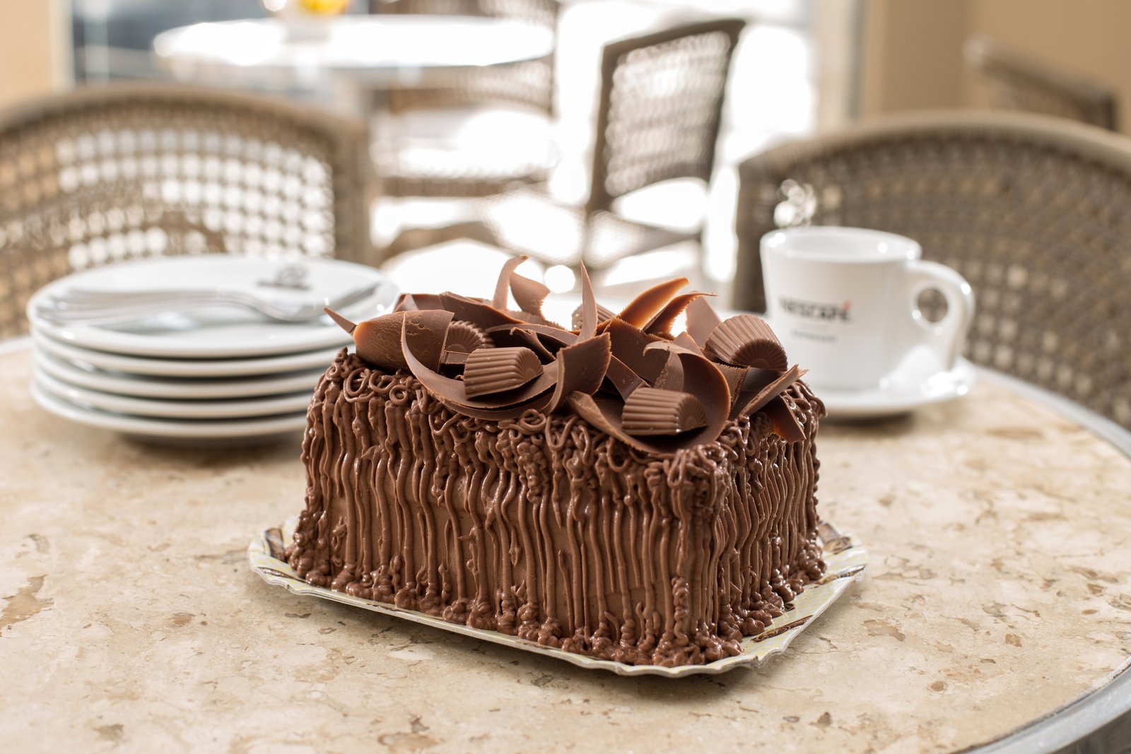 O bolo # 113 do cardápio é produzido com massa de pão de ló de chocolate, recheio de Alpino trufado e mousse de chocolate, cobertura de trufa de chocolate meio amargo, raspas de chocolate ao leite e bombom Alpino.