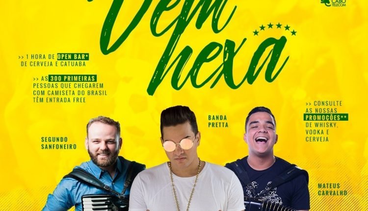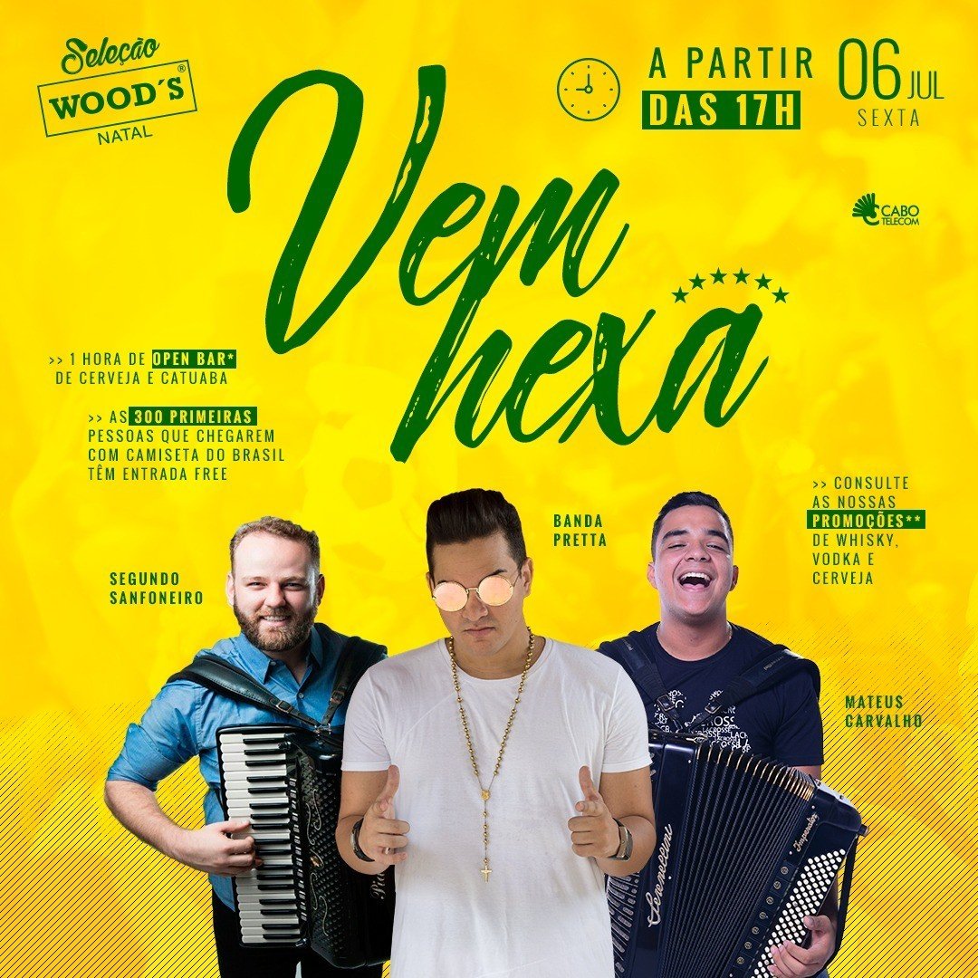 A animação após o jogo da Seleção Brasileira nesta sexta (6) promete ser grande na Woods Natal. A casa preparou uma super festa com grandes atrações e promoções para agitar a noite dos potiguares. As 300 primeiras pessoas que chegarem com a camisa do Brasil terão entrada free. Além disso, a noite terá uma hora de open bar de cerveja e catuaba e promoções de whisky, vodka e cerveja. O agito terá início às 17h e contará com shows de Segundo Sanfoneiro, Banda Pretta e Mateus Carvalho.