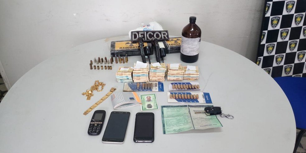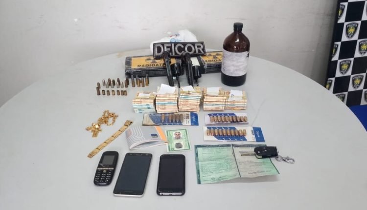 Na manhã desta segunda-feira, as equipes conseguiram prender o suspeito quando ele estava em um veículo. Com ele, os policiais apreenderam dois revólveres calibre .38 sem registro, munições de calibre .38 e 380, além de drogas e R$ 43 mil.